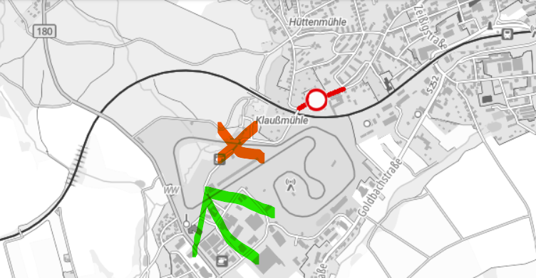 - Aufgrund einer Baustelle ist der Zugang zur Rennstrecke nur über die Lerchenstraße aus Richtung des Gewerbegebietes über die Wüstenbrander Straße möglich.
